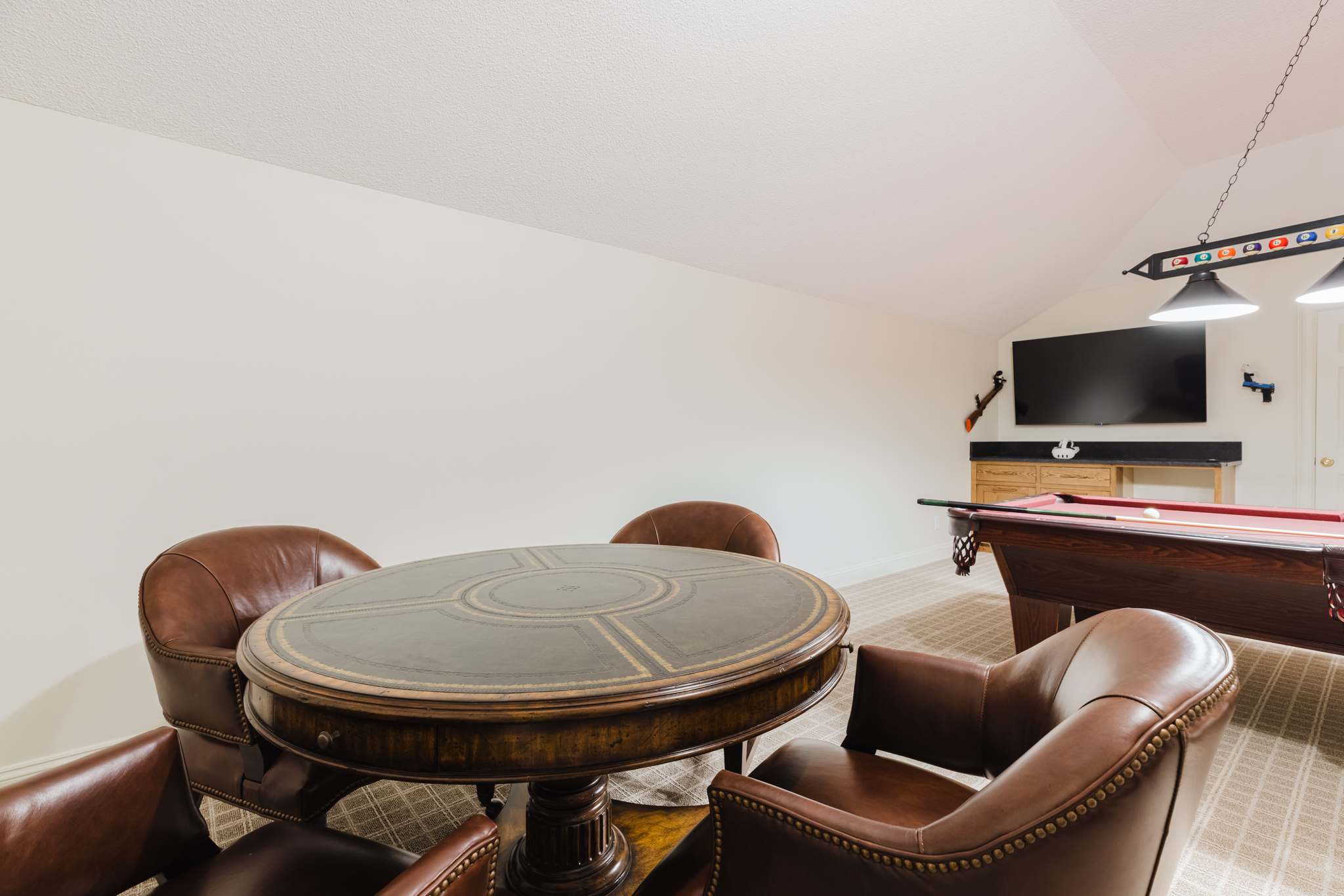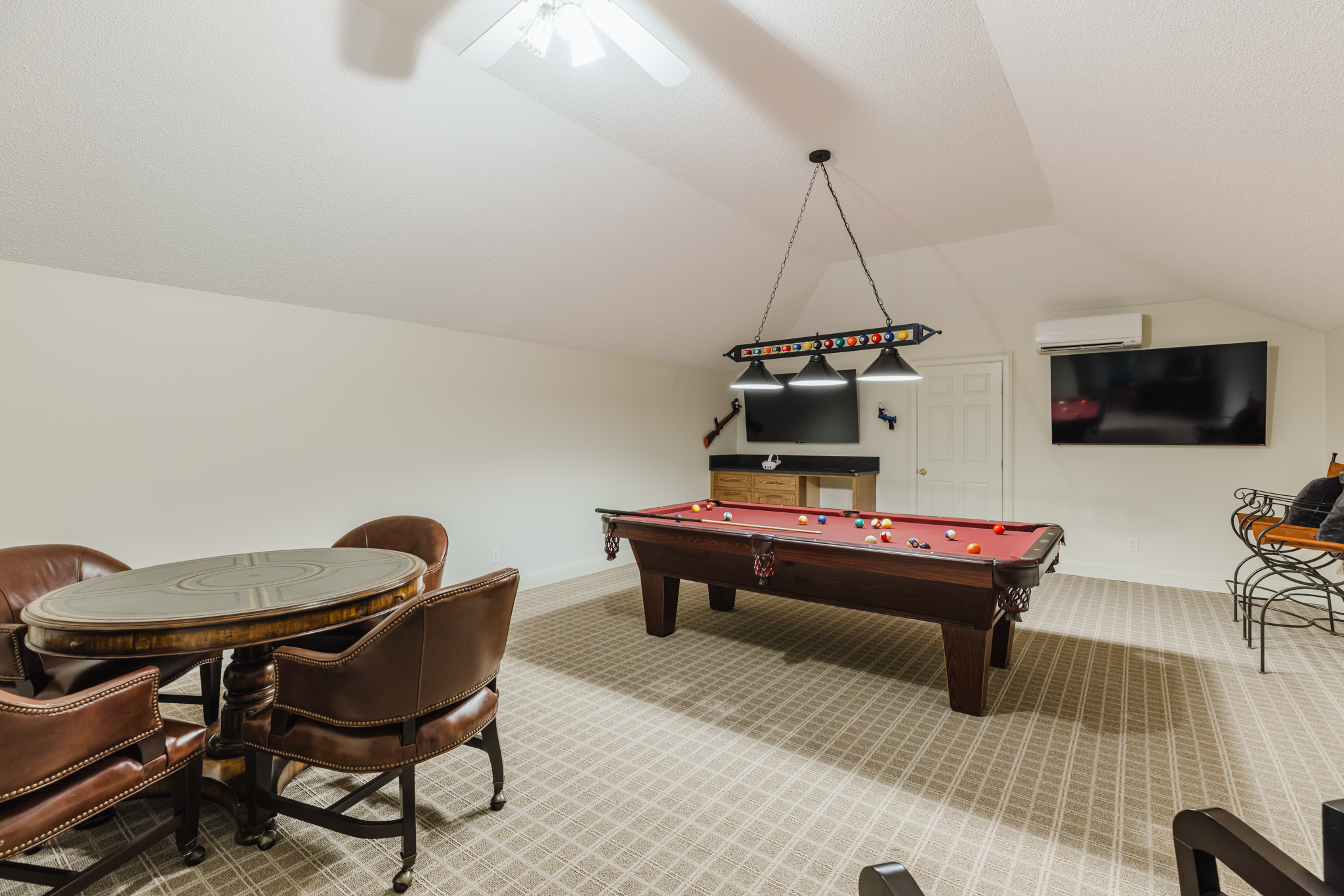 Upstairs, a game room invites relaxation and camaraderie with its pool table, poker table, and dual large-screen monitors, including virtual reality shooting game.